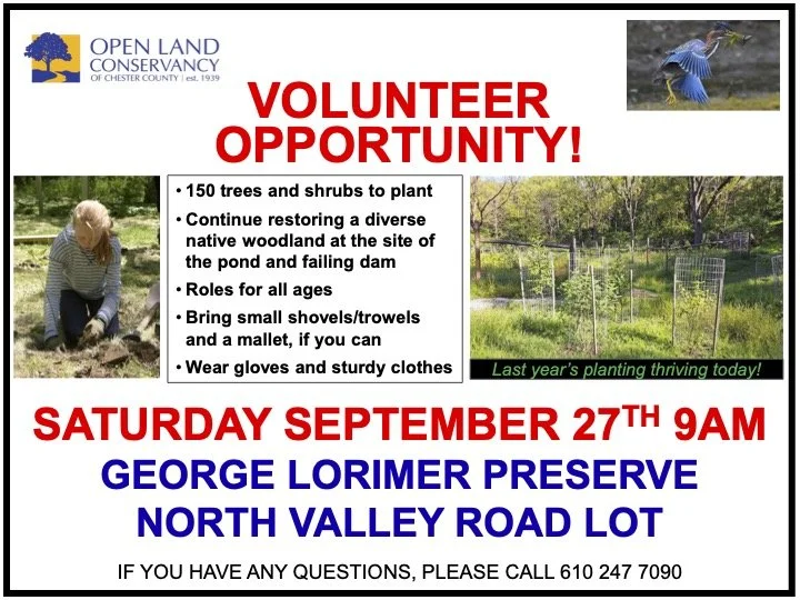 Please join us on September 27th at 9am in the George Lorimer Preserve to plant the trees and shrubs that will restore a diverse native woodland. All welcome!